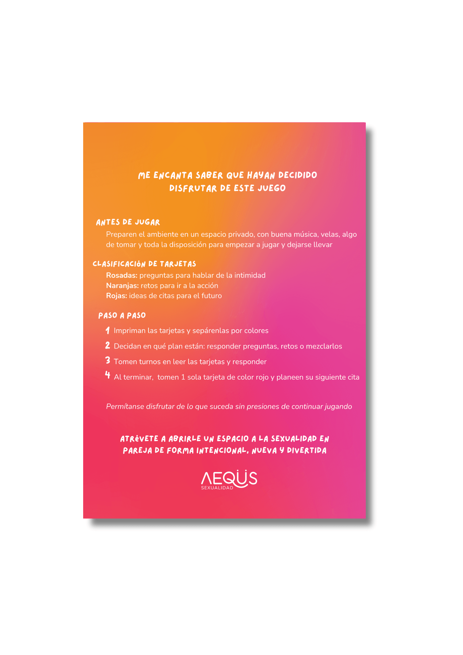 Disfruta de 120 tarjetas digitales con preguntas, retos y citas sexuales diseñadas para aumentar la intimidad, explorar nuevas fantasías y mantener la chispa viva con tu pareja. Perfecto para momentos íntimos, noches especiales o citas diferentes